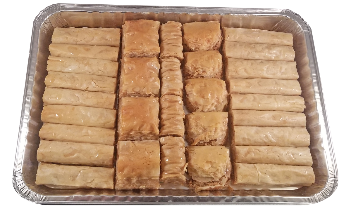 A rich mix of Middle Eastern Baklava consisting of fine sheets or shredded phyllo dough, layered with carefully selected walnuts or cashews. Using purified butter, our assorted baklava baked and soaked in our special sugar syrup, and packed fresh when ordered in tray.